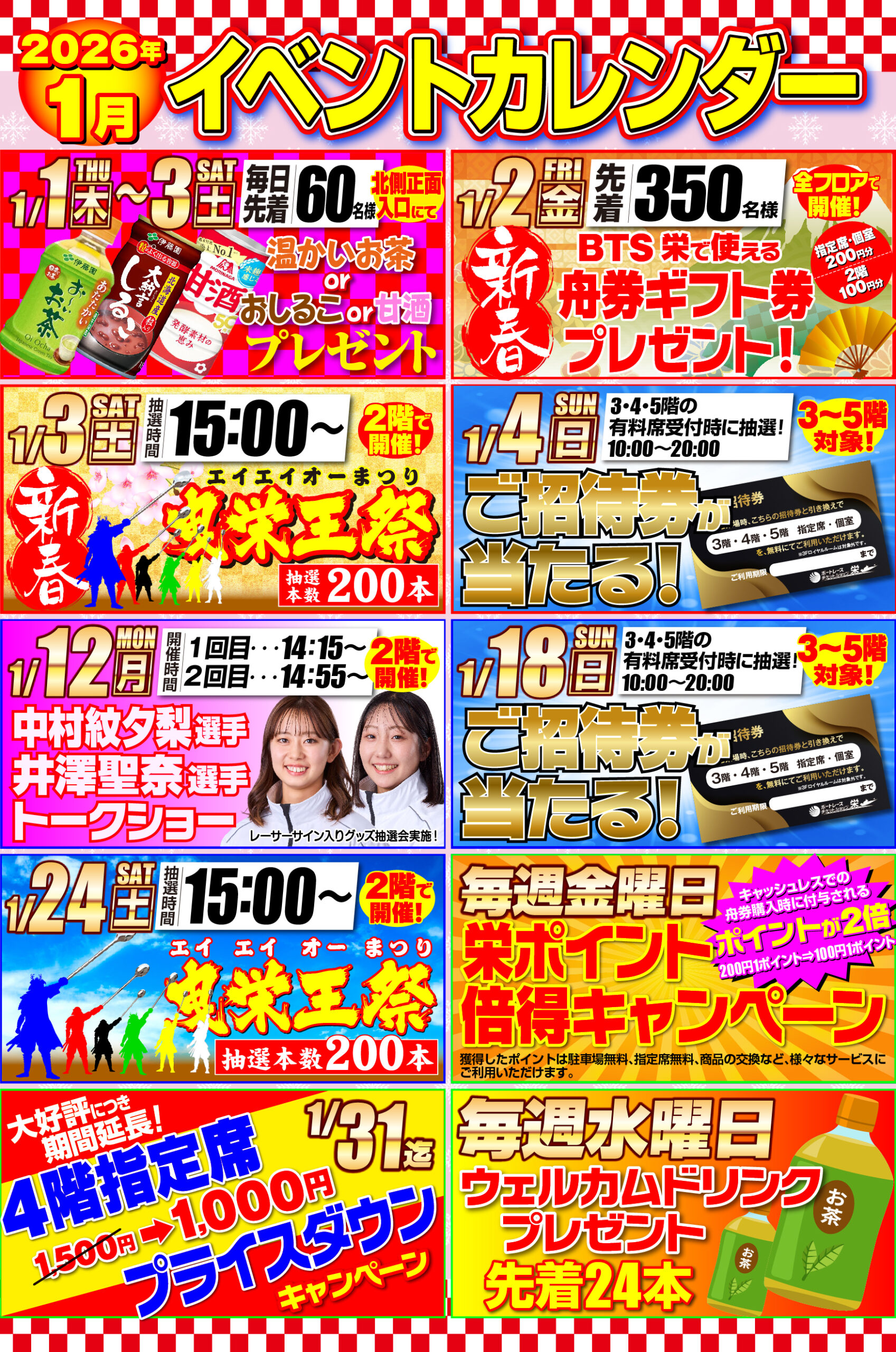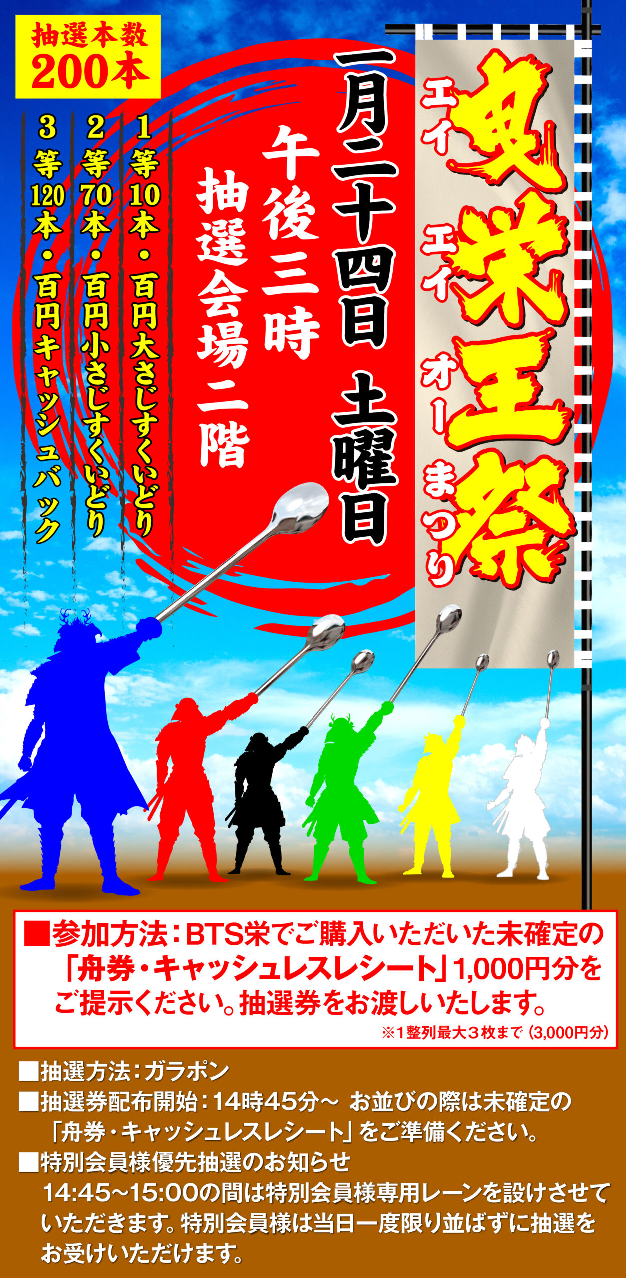 *抽選会の参加には、BTS栄でご購入いただいた未確定の「舟券・キャッシュレスレシート」1,000円分をご提示ください。
