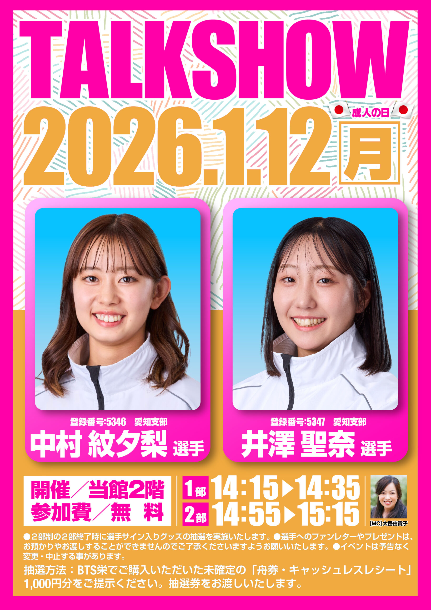 愛知支部の若手レーサー同期の中村紋夕梨選手と井澤聖奈選手をお招きしてトークショーを開催いたします。